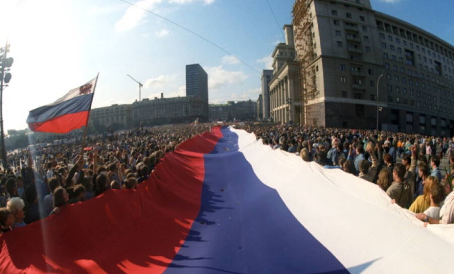 Обложка: Российский триколор на улицах Москвы 22 августа 1991 года, после провала путча ГКЧП. Источник: arbatovagidepar.livejournal.com