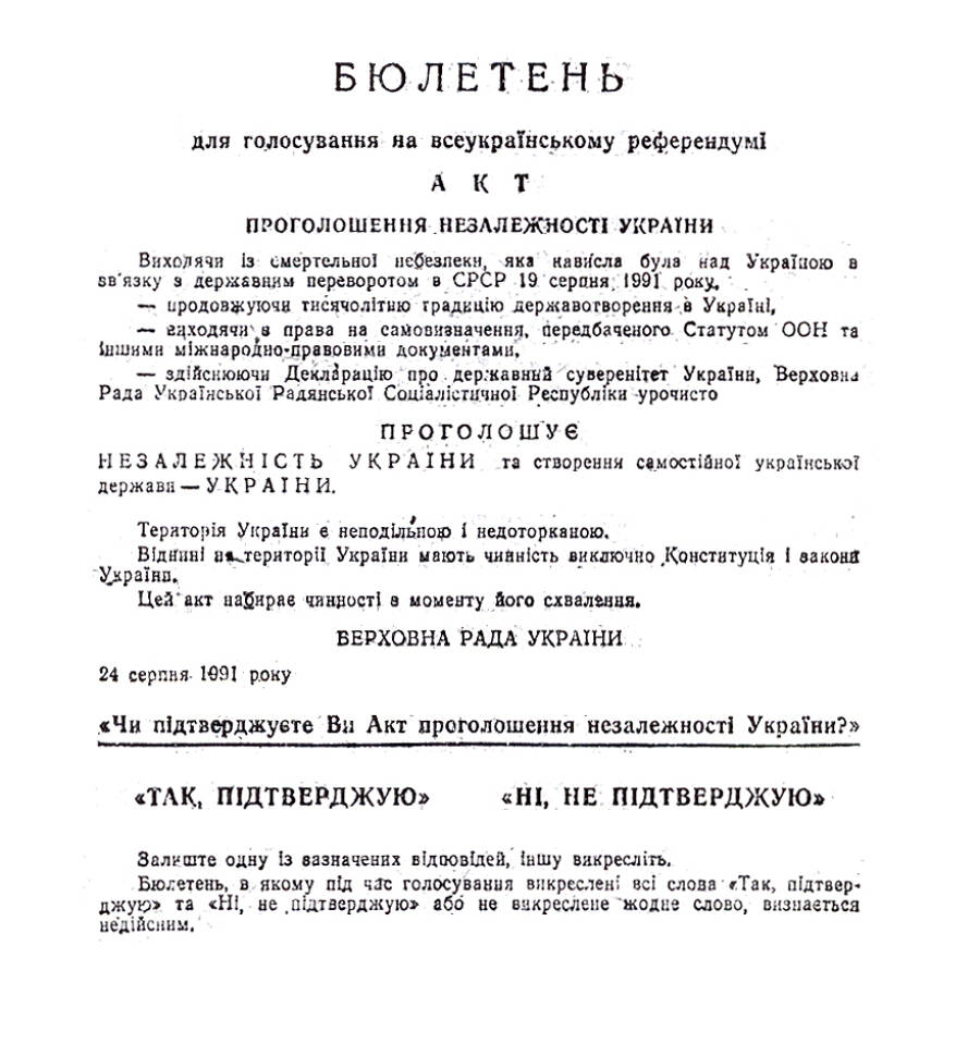 В тексте Акта провозглашения независимости Украины говорилось: "Исходя из смертельной опасности, нависшей над Украиной в связи с государственным переворотом в СССР 19 августа 1991 года, продолжая тысячелетнюю традицию государственного на Украине, исходя из права на самоопределение, предусмотренного Уставом ООН и другими международно-правовыми документами, осуществляя Декларацию о государственном суверенитете Украины, Верховный Совет Украинской Советской Социалистической Республики торжественно провозглашает независимость Украины и создание самостоятельного украинского государства - УКРАИНЫ".