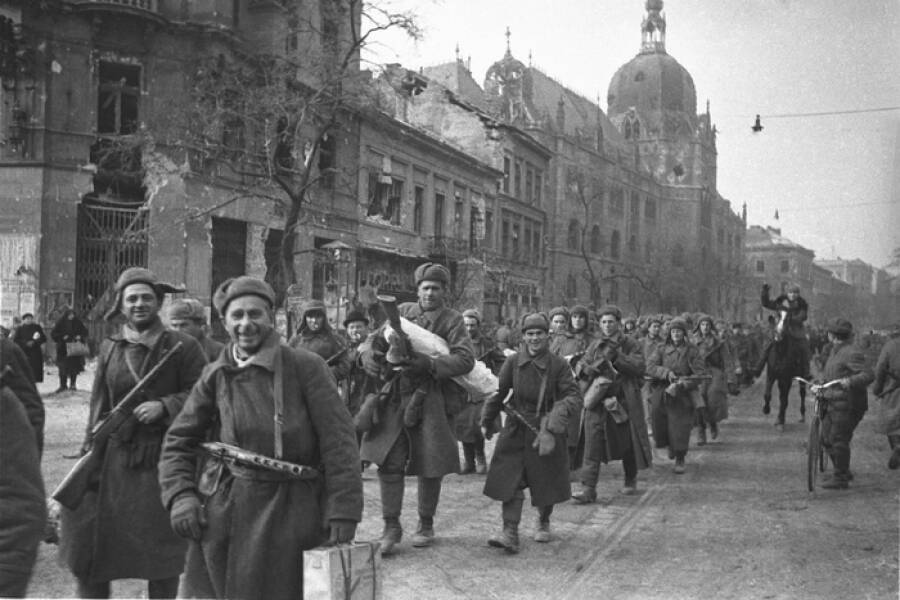 Советские солдаты осматривают брошенную технику в Будапеште. Источник: ЦАМО РФ