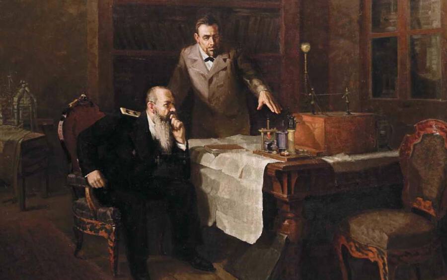 А.С. Попов демонстрирует прием первой в мире радиограммы. Источник: https://ria.ru