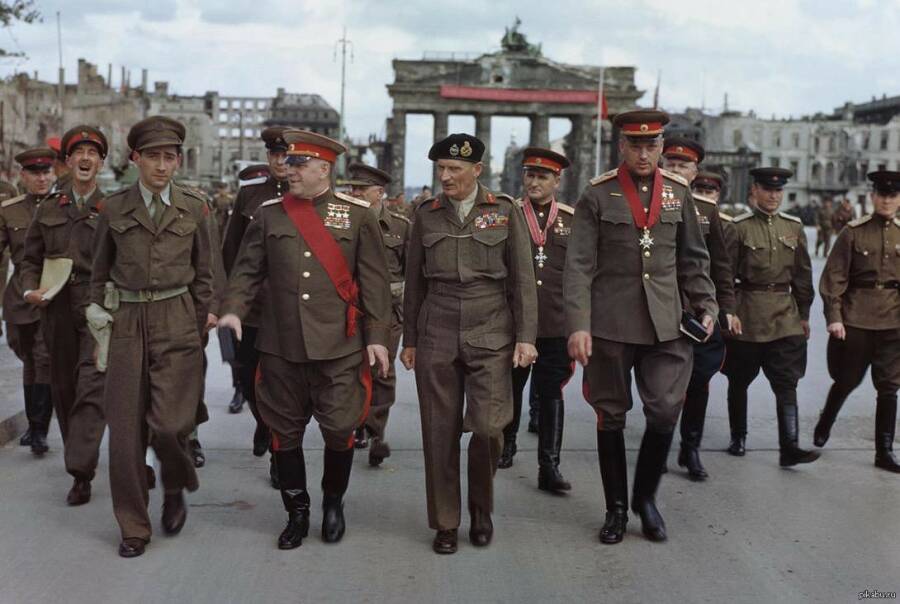 Отдельно стоит сказать о тех наградах, которых удостаивались высшие военачальники стран-союзников. Например, 5 июня 1945 года маршал Советского Союза Георгий Жуков получил из рук генерала Дуайта Эйзенхауэра орден «Легион почета», причем высшей степени – с титулом «Главнокомандующего». Такой же награды удостоились маршалы Советского Союза Александр Василевский и Иван Конев, Родион Малиновский и Кирилл Мерецков, Константин Рокоссовский и Леонид Говоров. От Британской империи советские военачальники получили не менее высокие награды. В тот же день фельдмаршал Бернард Монтгомери заявил, что маршал Жуков стал Почетным рыцарем Большого Креста ордена Бани, маршал Рокоссовский – Почетным рыцарем-командором ордена Бани, генерал армии Василий Соколовский – Почетным рыцарем Большого Креста ордена Британской империи. Советская сторона тоже не осталась в долгу: в тот же день в Москве приняли решение наградить главнокомандующего союзными силами в Европе генерала Эйзенхауэра орденом «Победа». Такой же награды удостоился его заместитель фельдмаршал Монтгомери, а французского главкома генерала армии Жана де Латр де Тассиньи наградили орденом Суворова I степени.