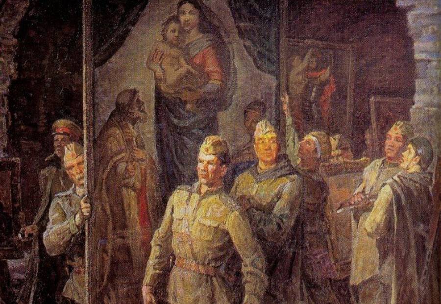 В результате британского авианалета под кодовым названием «Удар грома» был частично разрушен архитектурный комплекс Цвингер – место хранения шедевров Дрезденской галереи, среди которых картины Рафаэля, Тициана, Рембрандта и других выдающихся европейских живописцев. Машина, перевозившая 150 картин в день бомбардировки, сгорела дотла. Что стало с другими полотнами, предстояло выяснить советскому командованию. Перед Красной Армией была поставлена задача в короткие сроки отыскать и спасти экспонаты галереи. Возглавил группу поиска картин младший лейтенант Леонид Наумович Рабинович, служивший в 164-м рабочем батальоне 5-й гвардейской армии 1-го Украинского фронта (впоследствии об этом эпизоде он напишет повесть «Семь дней»). До начала войны он был художником и знал, что именно находится в Дрезденской галерее. Кроме того, Рабинович прекрасно владел немецким и мог подробно расспросить уцелевших жителей о пропавших шедеврах.