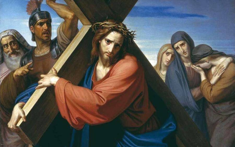 Итак, рано утром Иисуса ведут на лобное место – Голгофу. Он несет горизонтальную перекладину креста, Его руки привязаны к ней. В качестве перекладины часто использовался дверной засов – балку весом около 50 кг. Изможденный предыдущими страстями, Христос, по-видимому, падает (возможно, не один раз), бьется о твердую землю. Когда Он уже не может нести древо Сам, сопровождающие воины заставляют нести эту балку проходящего мимо человека – Симона Киринеянина.