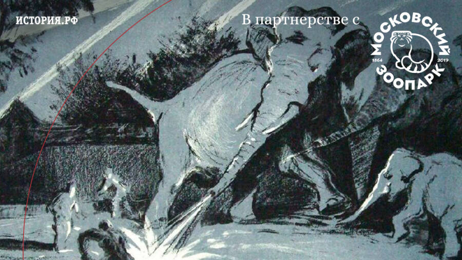 «Никто не обратил внимания, как слон взял камень и подошёл к барьеру. Служитель уже собирался уходить, когда за его спиной раздался звон разбитого стекла и огромный камень просвистел над его головой и упал на письменный стол. Вдребезги разлетелся чернильный прибор, чернила залили бумаги, а в разбитое окно летели другие камни».