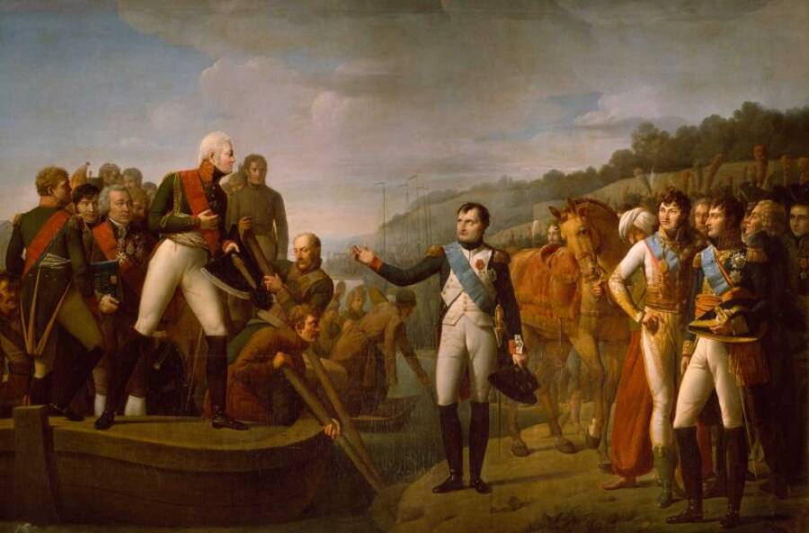 Для императоров Наполеон и Александр на плоту посредине реки был построен крытый павильон, где они и встретились 25 июня 1807 года