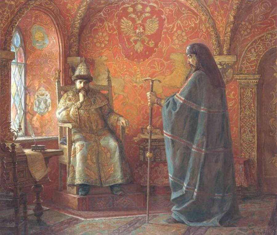 «Бунташный» XVII век был богат на потрясения, в числе которых и раскол в русской православной церкви, произошедший после религиозной реформы патриарха Никона. Алексей Михайлович, второй царь из новой династии, на подобный эффект явно не рассчитывал, но продолжил поддерживать Никона. Союз царя и патриарха выглядел нерушимым: Алексей называл Никона «собинным другом», позволил зваться государем и оставлять подпись на важнейших государственных документах. Неизвестно, окончилась бы когда-нибудь эта идиллия, если бы не темперамент патриарха. Почувствовав реальную власть, Никон открыто заявил: «Священство выше царства» (то есть духовная власть выше светской).