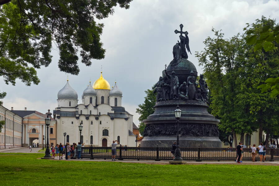 К нему готовились как к большому торжеству. В город прибыли войска, представители знати и других сословий, а 7 сентября на пароходе по Волхову прибыл в Новгород Александр II с семьей и приближенными. Открытие монумента, который по замыслу автора должен был «благовестить потомкам о героическом прошлом России», закончилось военным парадом. Вечером в городе происходили «народные гуляния». Монумент получился внушителен по размерам: высота его - 15,7 метра, диаметр гранитного постамента - 9 метров, высота скульптурных групп - 3,7 метра, высота фриза на пьедестале - около 1,5 метра, длина - около 27 метров, вес бронзового литья 65,5 тонны. На памятнике размещены 129 фигур.