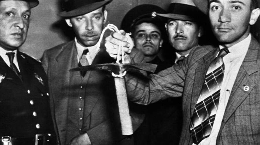 Обложка: Мексиканская полиция демонстрирует ледоруб, которым Роман Меркадер нанес смертельный удар Льву Троцкому. Источник: gazeta.ru