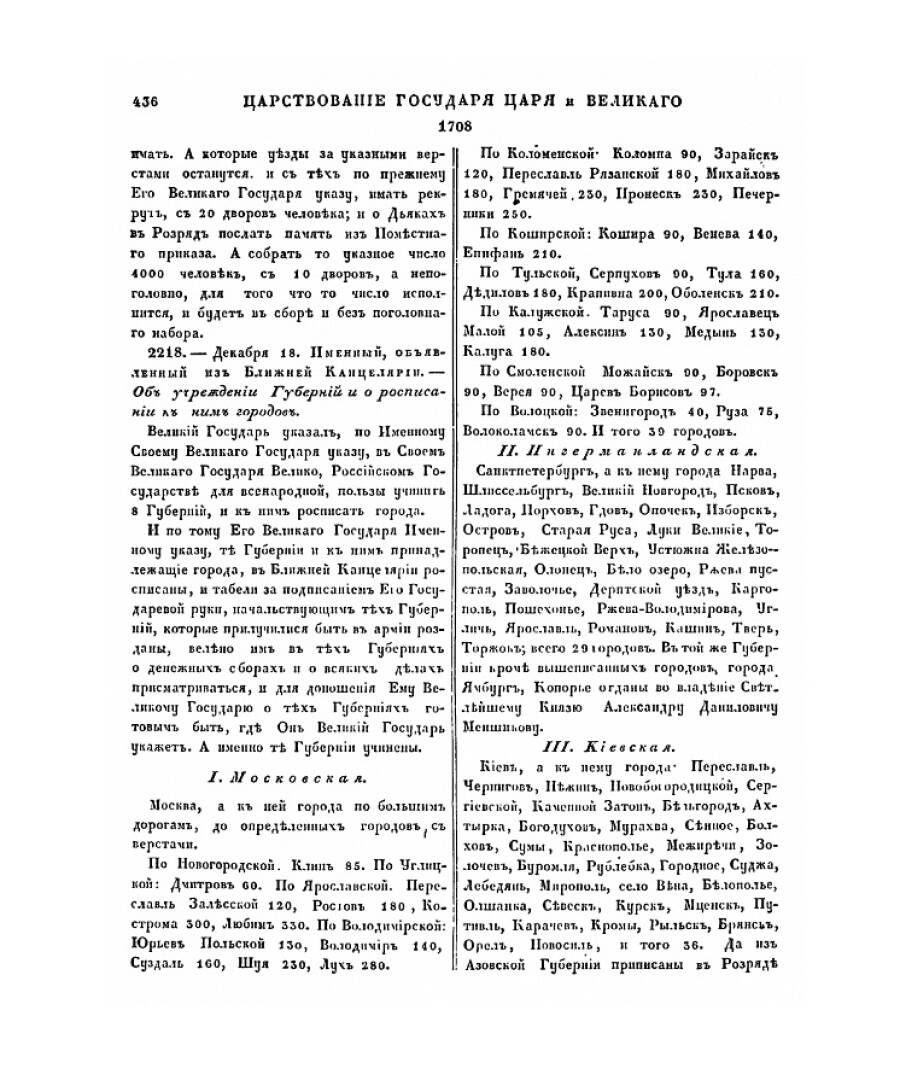Великий государь указал, по именному своему великого государя указу, в своем великого государя великом Российском государстве для всенародной пользы учинить 8 губерний и к ним росписать города. И по тому его великого государя именному указу, те губернии и к ним принадлежащие города, в Ближней Канцелярии росписаны, и табели за подписанием его государевой руки, начальствующим тех губерний, которые прилучилися быть в армии розданы, велено им в тех губерниях о денежных сборах и о всяких делах присматриваться, и для доношения ему великому государю о тех губерниях готовым быть, где он великий государь укажет.