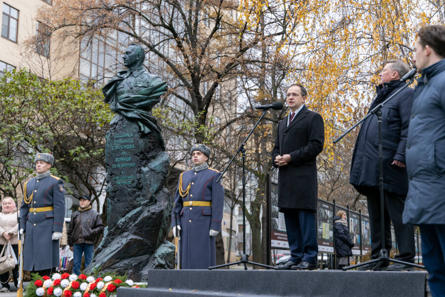 Сегодня, стоя у памятника и вглядываясь в волевое лицо молодого генерала Ефремова, мы сквозь него вглядываемся и в лица наших солдат, офицеров, добровольцев - героев сегодняшнего дня. И убеждаемся: традиции воинской доблести, офицерской чести - продолжаются.