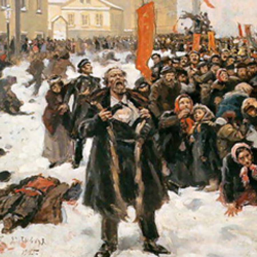 И вдруг раздается голос: не с прошением надо обращаться к царю, а с требованиями. Не безоружными надо выступать, а вооруженными, чтобы свергнуть самодержавие. Это говорил товарищ Серебровский, стоявший в окружении других большевиков. Переодетые полицейские пытались арестовать его. Но рабочие оттеснили жандармов к стене и помогли большевику скрыться.