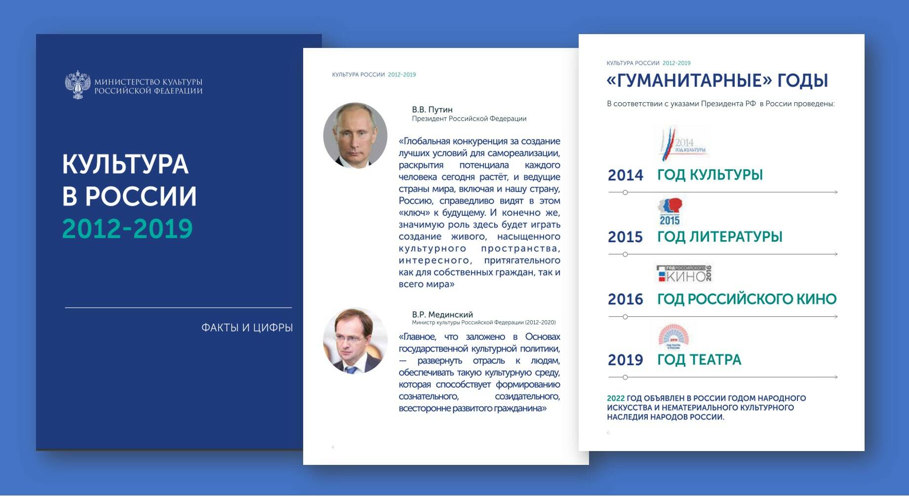 Министерством культуры РФ выпущен официальный отчет «Культура в России 2012–2019». Выбранный временной интервал ясно говорит о том, что в документе подводятся итоги деятельности ведомства под руководством Владимира Ростиславовича Мединского.