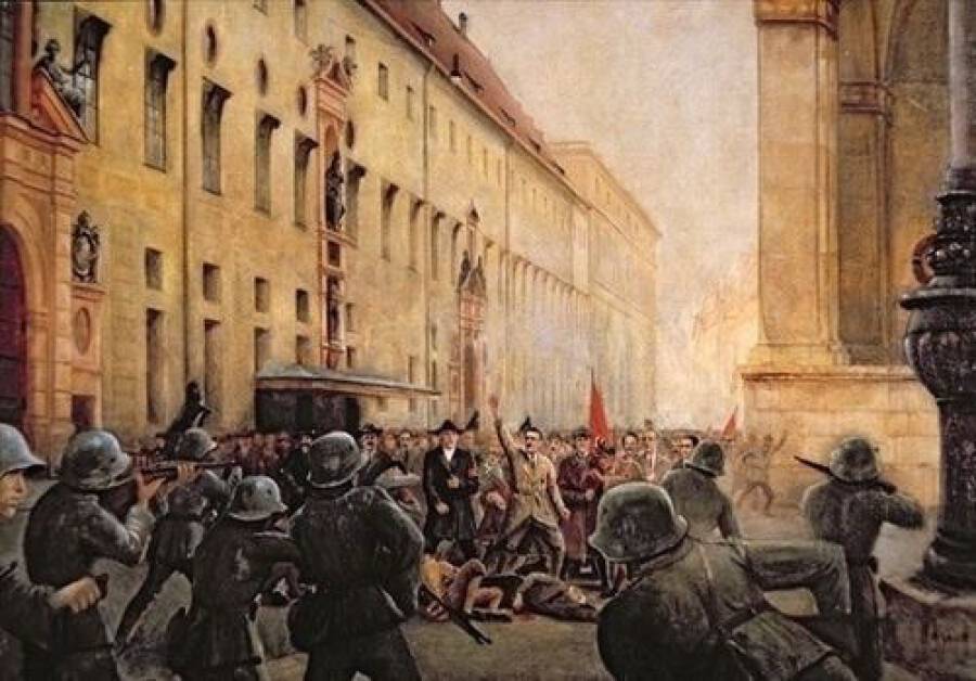 Колонна нацистов во главе с Гитлером, Герингом, Гессом, Штрейхером и Людендорфом под знаменем со свастикой попытались сбить заслон на входе к площади, состоящий из чуть более сотни полицейских. Сначала их пытались уговорить отойти, а потом нацисты пошли врукопашную. Грянули залпы полицейских винтовок. Нацисты, сраженные пулями, стали падать на землю, а уцелевшие – разбегаться.