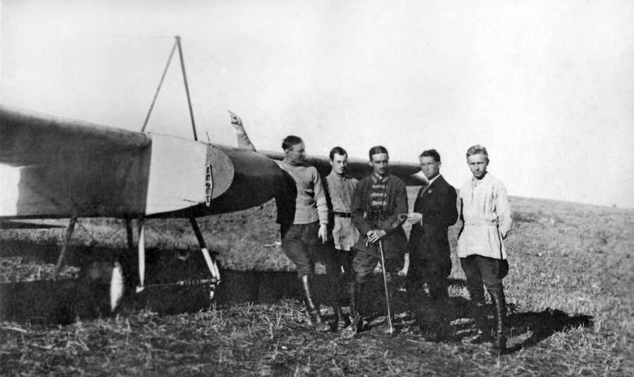 Александра Яковлева (крайний справа у крыла). Ноябрь 1923 года, Коктебель, гора Узун-Сырта