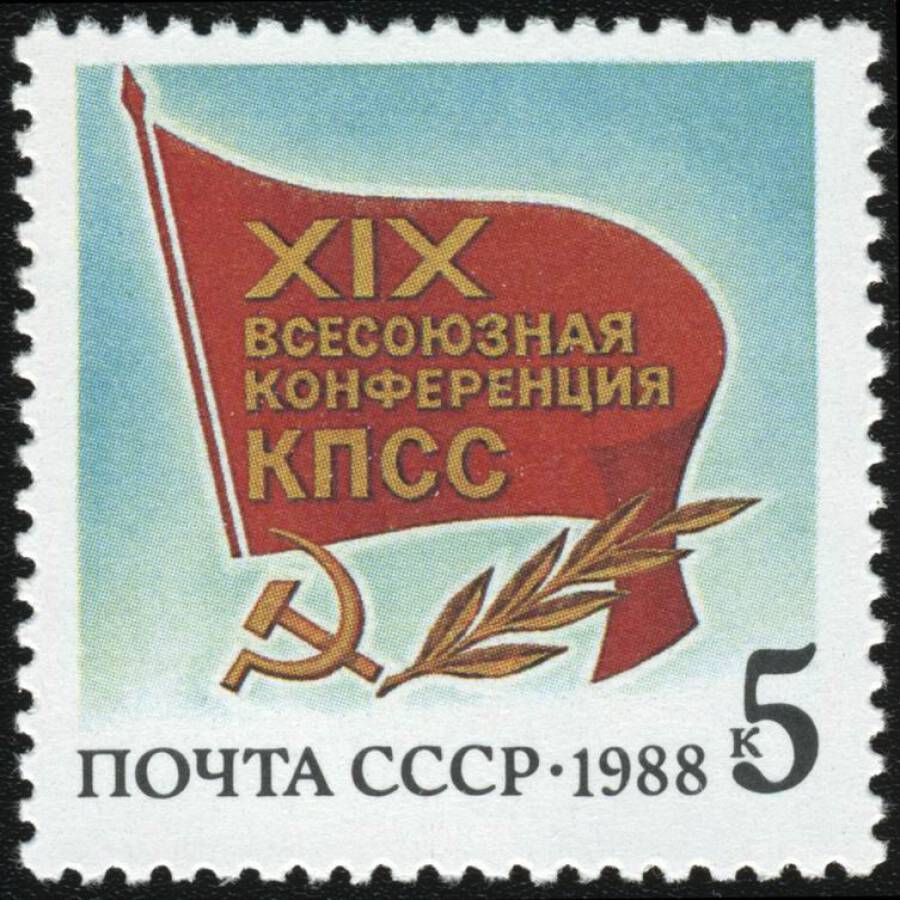 Обложка: почтовая марка Советского Союза «XIX партийная конференция. Эмблема конференции - Красное знамя, Серп, Молот и лавровая ветвь».1988.