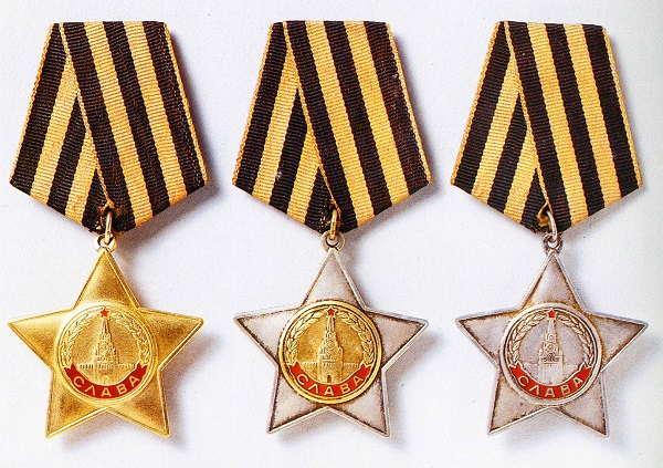 После Октябрьской революции 1917 года возрождение «георгиевской» традиции приходится на годы Великой Отечественной войны 1941-1945 гг. 8 ноября 1943 г. был учрежден Орден Славы трех степеней, вручавшийся красноармейцам за личные заслуги – шелковая муаровая лента, покрывавшая его колодку, носила черно-оранжевый цвет – практически полное повторение с лент знаменитого Георгиевского креста и Георгиевского знамени. На той же черно-оранжевой ленте ветераны носят медаль «За победу над Германией в Великой Отечественной войне 1941-1945 гг.», учрежденную 9 мая 1945 года. Предпоследний зал выставки посвящен именно этим героям – кавалерам Ордена Славы.