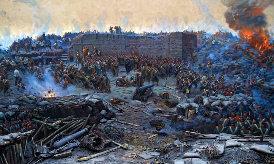 Не хватит слов объяснять и рассказывать картину того дня. Гром и молния легче бывают, нежели такой грандиозный штурм союзной неприятельской армии. Небо пороховым дымом заволокло, точно серыми тучами, треск ружейного огня, гром пушек, свист ядер, гранат, бомб. Как, пчёлы, в воздухе кружили, смертельно жалив, кто навстречу попадался-это, так сказать, адское препровождение времени во время боя переносило нас в другой мир.