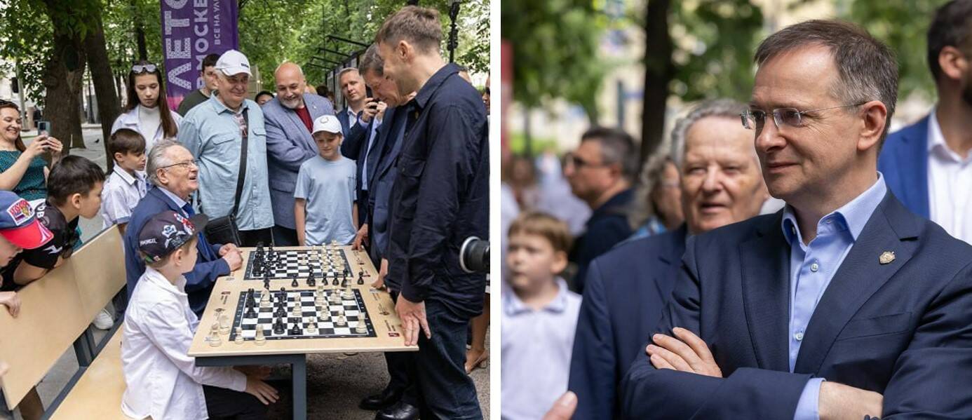 - Шахматы — это самая что ни на есть военно-историческая игра, которая может быть, и в шахматы у нас играют многие. Сейчас при помощи Департамента культуры Москвы, благодаря поддержке Федерации шахмат России, Шахматный клуб вышел на улицы города. До октября в любое время сюда можно будет прийти и поиграть в шахматы совершенно свободно. Можно принести свои шахматы. Если их нет, можно взять здесь, — отметил Владимир Мединский.