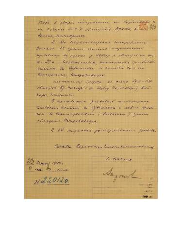Директива Ставки Верховного Главнокомандования от 23 июня 1944 г. № 220120 командующему войсками Карельского фронта о повышении темпов наступления на Олонецком и Медвежьегорском направлениях.
