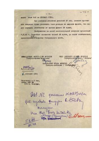 Донесение командующего войсками Карельского фронта от 5 августа 1944 г. № 0087/44/оп Верховному Главнокомандующему об обстановке перед войсками фронта и временном прекращении наступления войск 7 и 32 армий