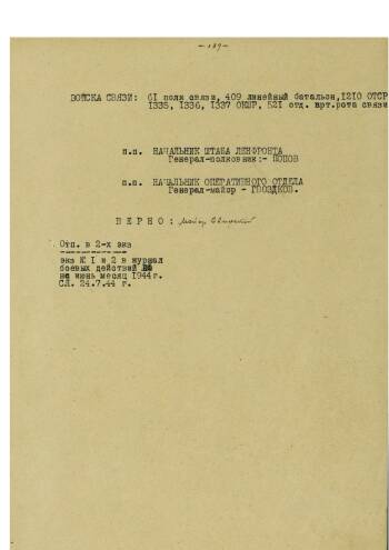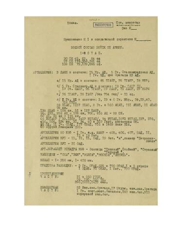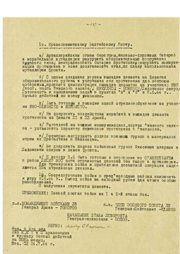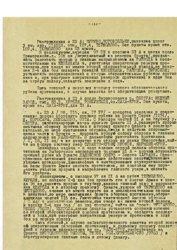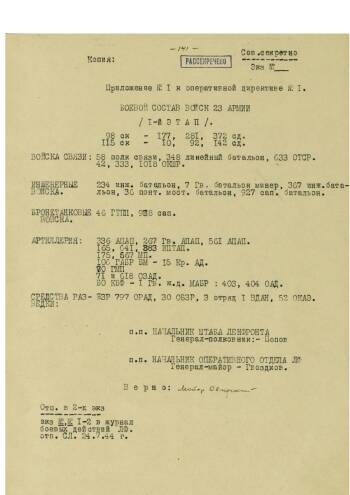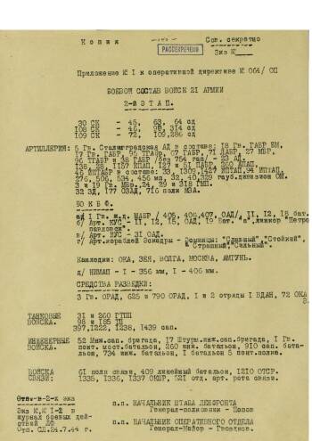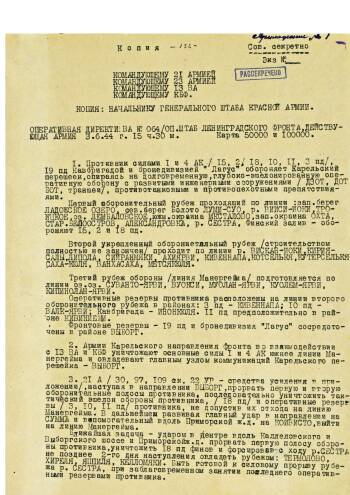Оперативная директива штаба Ленинградского фронта от 3 июня 1944 г. № 064/оп командующим войсками 21 и 23 армий, 13 Воздушной армии и командующему КБФ с задачами на наступление с указанием боевого состава армий.