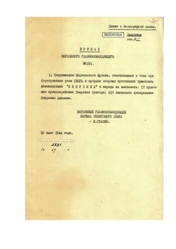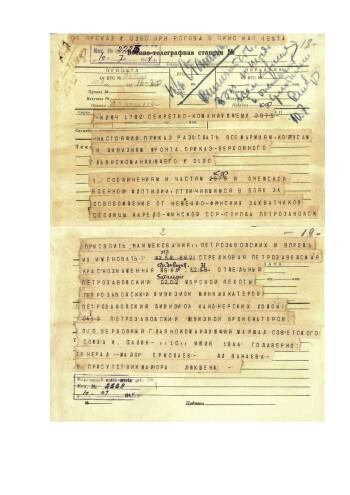 Приказ Верховного Главнокомандующего от 10 июля 1944 г. № 0190 о присвоении соединениям и частям Карельского фронта и Онежской Военной Флотилии, отличившимся в боях за освобождение г. Петрозаводска, наименований «Петрозаводских».