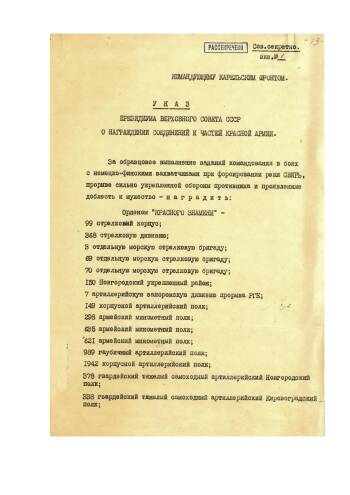 Указ Президиума Верховного Совета СССР от 2 июля 1944 г. о награждении соединений и частей Красной Армии орденом «Красного Знамени».