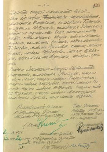 Report of the staff of the 1st Ukrainian front to the Supreme Commander-in-chief, Marshal of the Soviet Union I. V. Stalin. Describes: the fact of the joint capture of the German capital Berlin with the troops of the 1st Belorussian front, lists the titles and surnames of the commanders of units and formations of the front, whose troops most distinguished themselves in the battles for Berlin.