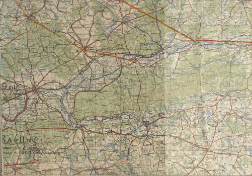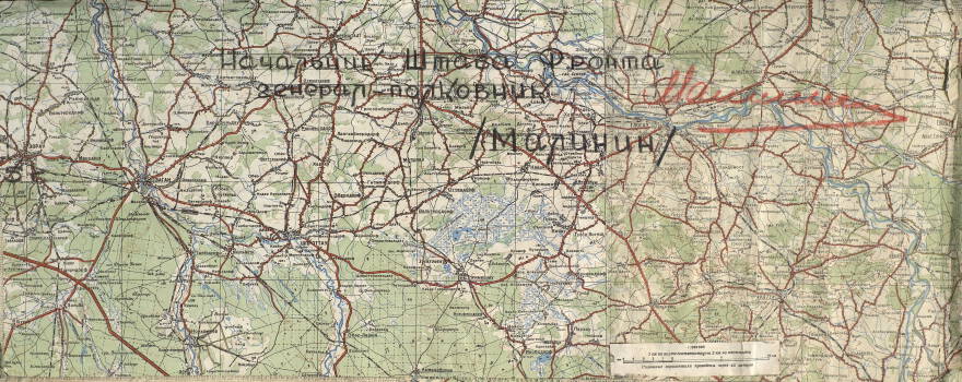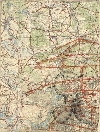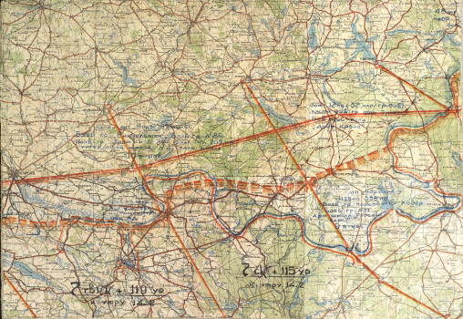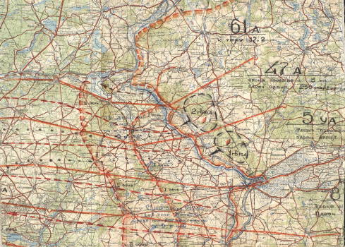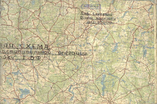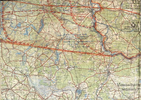 Map-plan of the Berlin strategic offensive operation, prepared by the Chief of staff of the 1st Belorussian front, Colonel-General Malinin. Described: the Situation on the Soviet-German front in the zone of action of the 1st Belorussian front troops before the start of the Berlin strategic offensive operation. The directions of strikes and movement of the front's units and formations, the location and further encirclement of enemy units are shown.