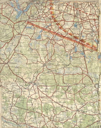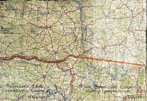 Карта-план Берлинской стратегической наступательной операции, подготовленная Начальником штаба 1-го Белорусского фронта генерал-полковником Малининым. Описывается: ситуация на советско-германском фронте в полосе действия войск 1-го Белорусского фронта перед началом Берлинской стратегической наступательной операции. Показаны направления ударов и движения частей и соединений фронта, места дислокации и дальнейшего окружения частей противника.