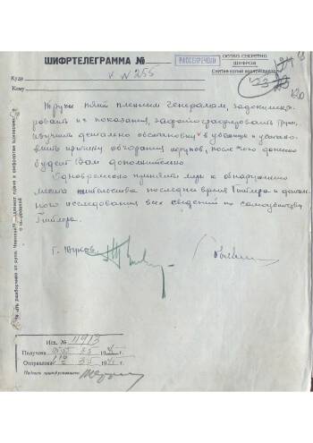 Шифротелеграмма Командующего 1-м Белорусским фронтом маршала Г.К.Жукову И.В. Сталину о данных разведки в отношении судьбы Гитлера и Геббельса