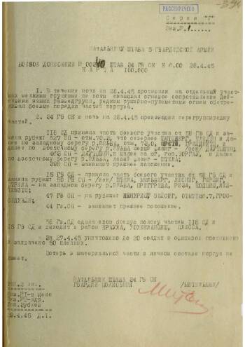Боевое донесение, подписанное начальником штаба 34-го гвардейского стрелкового корпуса гвардии полковником Мительманом. Описываются: перегруппировка и боевые действия частей корпуса и сопротивление частей противника.