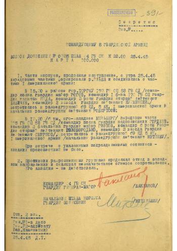 Combat report signed by the chief of staff of the 34th guards rifle corps. Described: the combat situation as of the evening of 25.04.1945. Of particular interest are the information about the first contacts with intelligence groups of American troops.