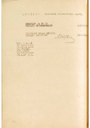 Боевое донесение, подписанное начальником штаба 34-го гвардейского стрелкового корпуса гвардии полковником Мительманом. Описываются: боевые действия частей корпуса и сопротивление частей противника. Особый интерес представляют сведения о первых контактах с разведгруппами американских войск.