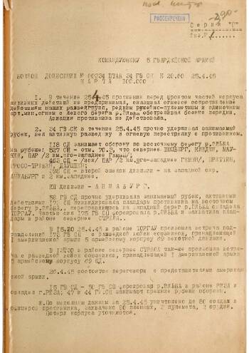 Combat report signed by the chief of staff of the 34th guards rifle corps of the guard, Colonel Mitelman. Describe: the fighting parts of the body and the resistance of enemy units. Of particular interest are the information about the first contacts with reconnaissance groups of American troops.
