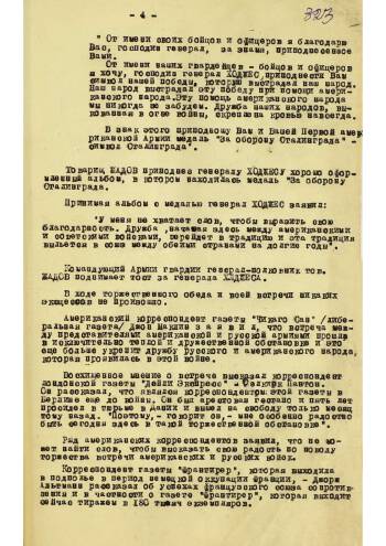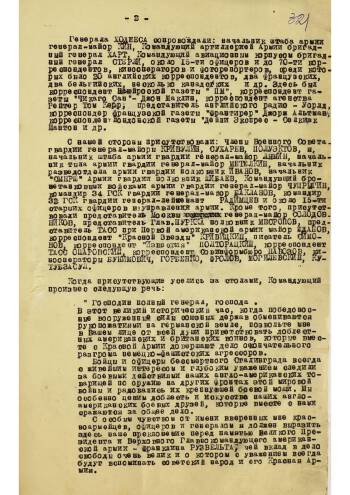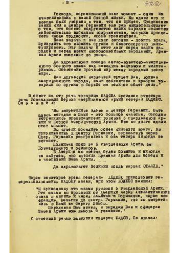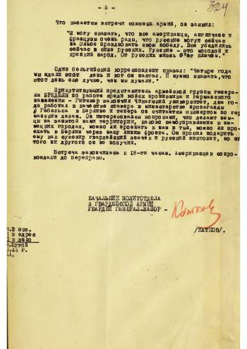 The report of the chief of the political Department of the 5th guards army from may 1, 1945 guard major General Katkov, the head of the political Department of the 1st Ukrainian front the major General Yashechkin about the meeting on 30 April 1945 the commander of the 5th guards army, Colonel-General Zhadova and the commander of the 1st us army of General Hodges. It describes: the composition of delegations, transcripts of speeches and other details of the meeting.