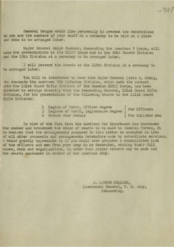 Письмо генерал-лейтенанта Коллинса генерал-полковнику Жадову с перечнем американских орденов для награждения командного состава частей и соединений 5-й гвардейской армии.