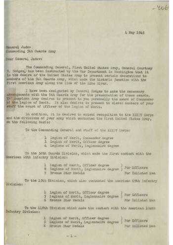 Письмо командира 7-го армейского корпуса американской армии командующему 5-й гвардейской армии РККА