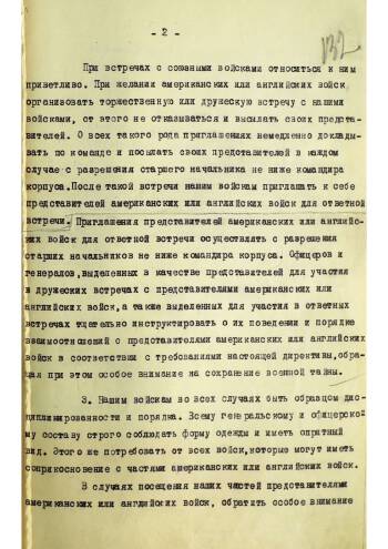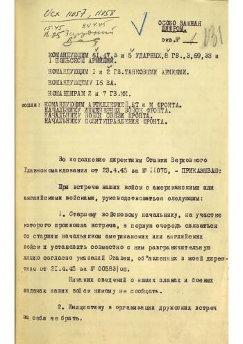 Шифр-телеграмма командующего 1-м Белорусским фронтом Г.К. Жукова о действиях войскового начальства Красной Армии при встрече с американскими и английскими войсками. Описывается: порядок установки связи и встреч с союзными войсками. Устанавливается ответственность старших по званию командиров во время проведения этих встреч. Регламентируется порядок посещений наших частей союзниками и наоборот. Особое внимание уделяется вопросам дисциплины и формы одежды наших бойцов и командиров. Предписывается сообщать номера всех воинских частей, встреченных нашими войсками.