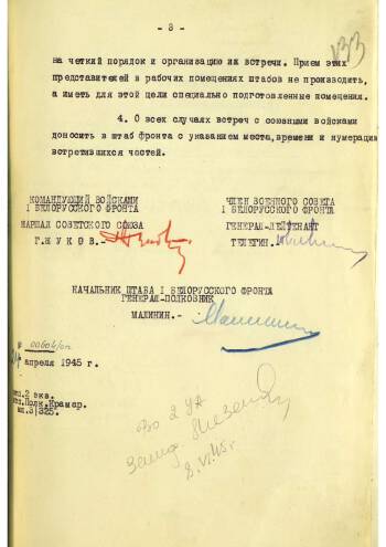 The telegram code from the commander of the 1st Belorussian Front G.K.Zhukov about the actions ofthe military command of the Red Army at a meeting with the American and British troops. Described: the procedure for establishing communications and meetings with allied forces. The responsibility of senior commanders during these meetings is established. The order of visits of soviet units by the Allies and vice versa is regulated. Particular attention is paid to issues of discipline and uniforms of our soldiers and commanders. It is ordered to report the numbers of all allied military units met by soviet troops.