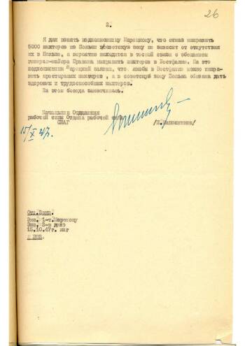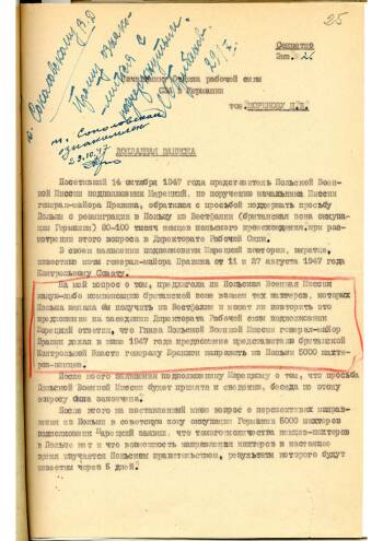 Письмо начальника Отдела рабочей силы СВАТ П.В.Моренова заместителю политсоветника СВАГ М.Г.Грибанову 22 октября 1947 г.