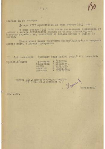 This is an act of atrocities in the Sobibor concentration camp on 06.22.1944. It is a fairly detailed survey of 8 local residents of the village Zhlobok Vtoroi. Civilians told Soviet officers about the atrocities committed by the Nazis in the camp, its construction. Also they named the approximate number of trains with prisoners had brought to the camp. The question also arises of the famous uprising of prisoners led by Soviet officer Pechersky. The process of the destruction of the camp of the German army is also described.