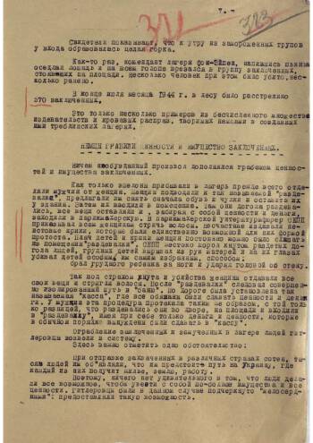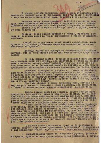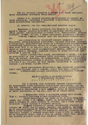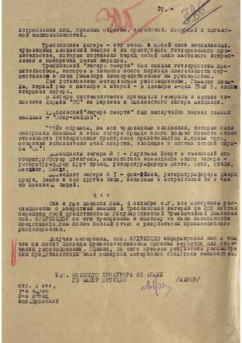 Доклад ИО военного прокурора 65-й армии гвардии майора юстиции Мазора о зверствах в концлагерях «Треблинка-1» и «Треблинка-2». Доклад предназначается для военного прокурора 1-го Белорусского фронта генерал-майора Яченина. Доклад в сжатой форме представляет материал 203-страничного расследования, проведенного советской военной прокуратурой в районе лагерей смерти. В этом докладе подробно изложена история лагерей «Треблинка», начиная с момента их создания, до момента их освобождения частями Красной Армии. Свидетельские показания, точное описание ужасов работы лагеря и другие подробности досконально восстановлены советскими военными прокурорами.