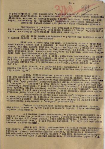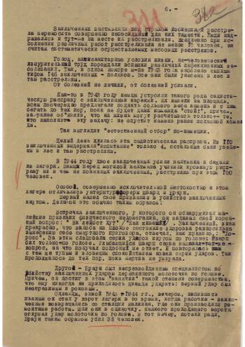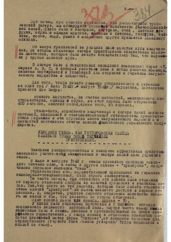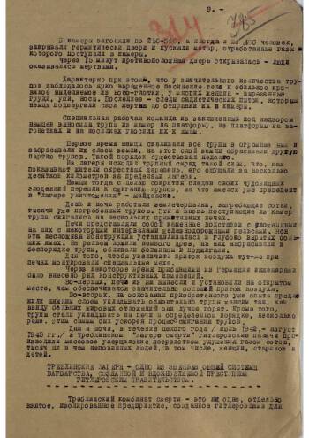This is a report of Major of Justice Mazor (intelligence office of the military prosecutor of the 65th Army) on the atrocities in the concentration camps "Treblinca-1" and "Treblinka-2". The report is intended for the military prosecutor of the 1st Belorussian Front, Major General Yachenin. The report summarizes the material of a 203-page investigation conducted by Soviet military prosecutors in the area of the death camps. In this report, the reader can familiarize themselves in detail with the history of the Treblinka camps, from the moment of their creation until the moment of their liberation by units of the Red Army. Witness testimonies can regarded as accurate description of the horrors of the camp and other details.