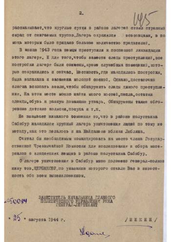 Докладная записка зам.начальника Главного Политуправления РККА генерал-лейтенанта Шикина главе Государственной чрезвычайной комиссии по установлению и расследованию злодеяний немецко-фашистских захватчиков Н.М. Швернику. Краткое резюме материаловсоветского следствия относительно лагеря смерти «Собибор».