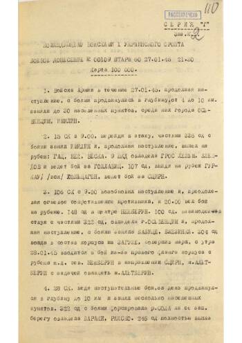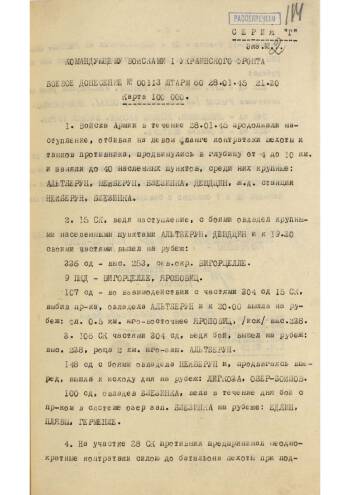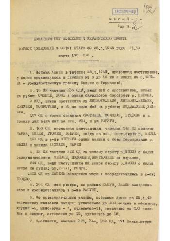 This is a set of report documents of the headquarters of the 60th Army of the 1st Ukrainian Front. It includes reports from January 25, to January 28, 1945, during the course of the Wisla-Oder strategic offensive operation of the Red Army. In general, these are standard combat reports describing the opposition of the enemy, the successes of our units, occupied settlements, captured trophies and prisoners.