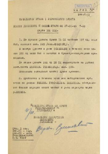 Комплект документов – донесений штаба 60-й армии 1-го Украинского фронта года в ходе проведения Висло-Одерской стратегической наступательной операции Красной Армии. Включает в себя донесения с 25.01 по 28.01.1945. Описывается: противодействие противника, успехи наших частей, занятые населенные пункты, взятие трофеев и пленных.
