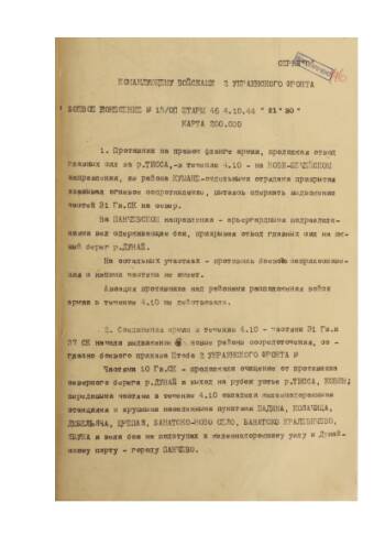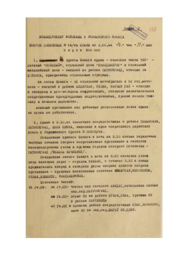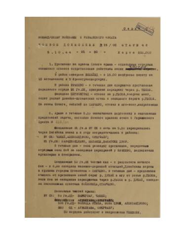 Боевые донесения штаба 46 армии от 3 октября 1944 г. № 14/оп, от 4 октября 1944 г. № 15/оп, от 5 октября 1944 г. № 15/оп Командующему войсками 2 Украинского фронта с решением «частями 10 ск выйти на фронт ..., Панчево» и описанием боя за Панчево.