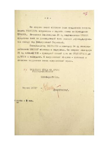 Специальное донесение начальника штаба 61-й армии № 00444 от 4 мая 1945 г. о встрече командира 23-й стрелковой дивизии с командиром 84-й американской пехотной дивизии генерал-лейтенантом Боллинге. Подлинник. Машинописный текст