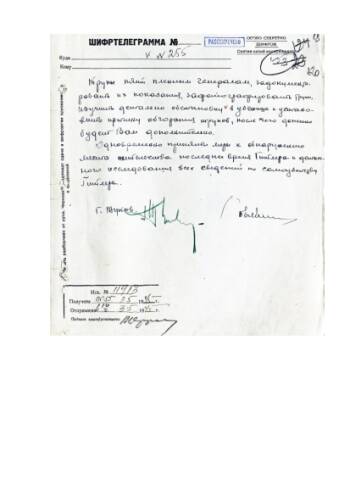 Телеграмма командующего 1-м Белорусским фронтом Г. Жукова от 03.05.1945 г. о самоубийстве А. Гитлера